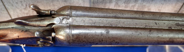 HME; 32" BBLs; Belgium Fine Damascus; easy break action; both mechs work; two triggers; solid wood; metal butt plate; bluing is gone; No Transfer due to age; Belgium; No SN#