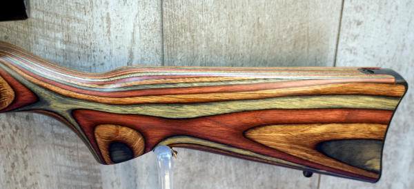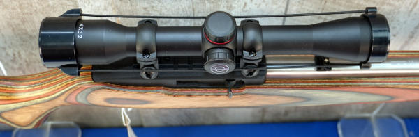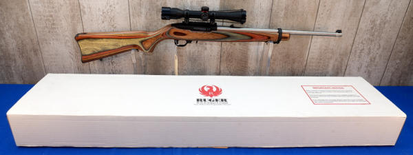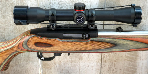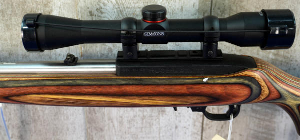 18.5" STS Barrel; looks mint & unfired w/factory box; mult-color wood grain laminate stock; removable magazine; Simmons 4x32 scope; USA; SN#355-89252; A-360