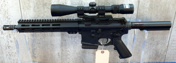 Transfers as a pistol; 11" BBL w/2" flash hider; looks near mint & unfired; Nikon 3-9x40 Scope on a Burris P.E.P.R. Scope rail; short magazine; USA; SN#M1-0370; A-369