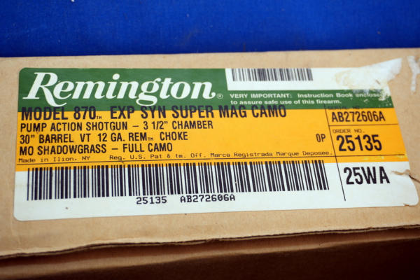 30" VR-BBL; looks very clean, believe it's been fired but very little; factory box; smooth action; Mossy Oak Shadow Grass camo scheme; 2.75", 3" & 3.5"; Rem-choke; rubber Recoil pad; USA; SN#AB272606A; A-360