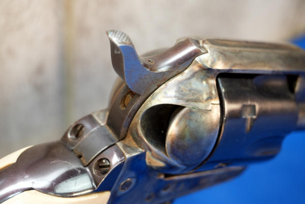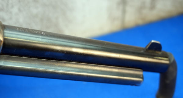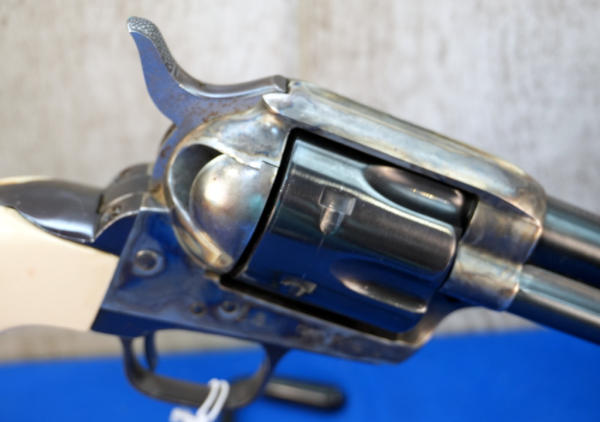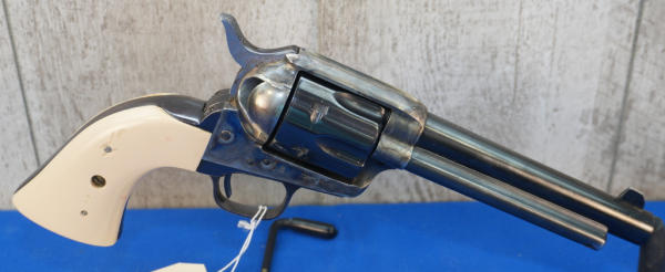 5.5" BBL; case hardened receiver; smooth white plastic grips; spotting on the hammer; 6-shot fixed cylinder; Italy; SN#125090; A-354
