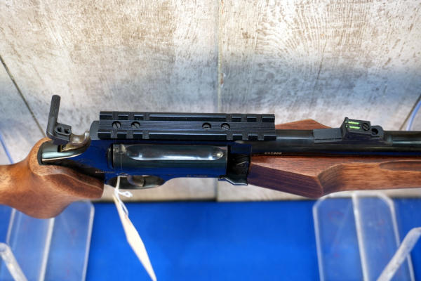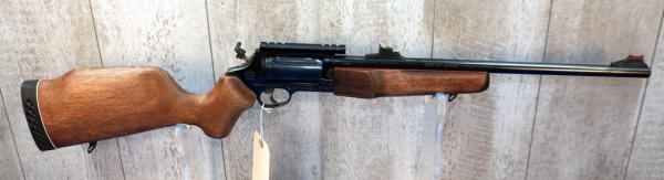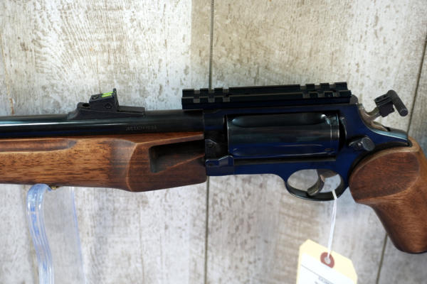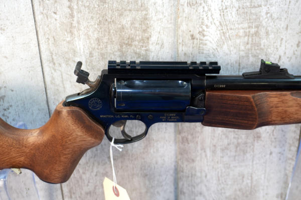 18.5" BBL; looks like new and unfired; rubber recoil pad; nice wood stock; 5-shot swing out cylinder; hy-vis front sight; picatinny rail; nice bluing; transfers as a rifle; Brazil; SN#EX2888; A-366