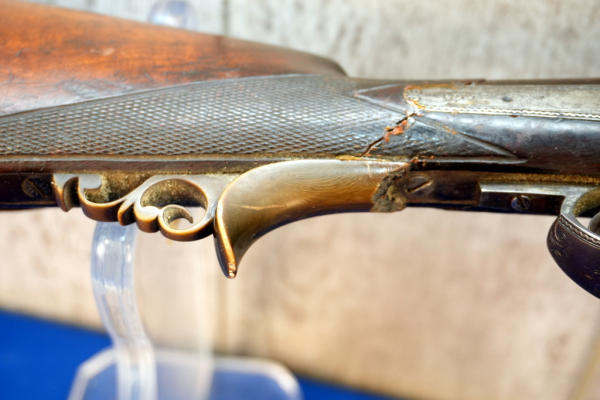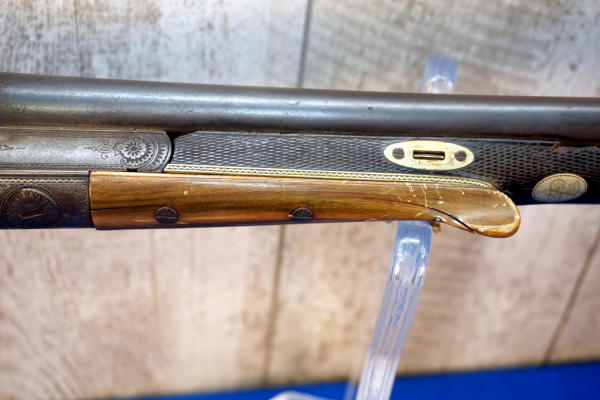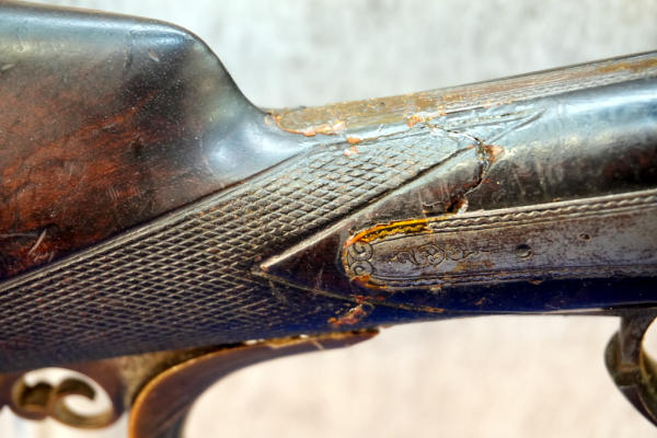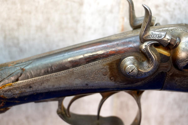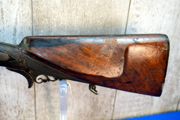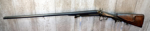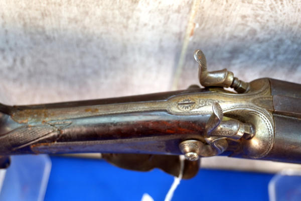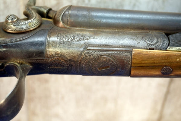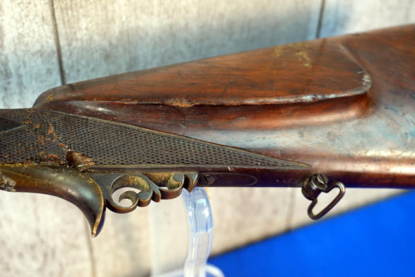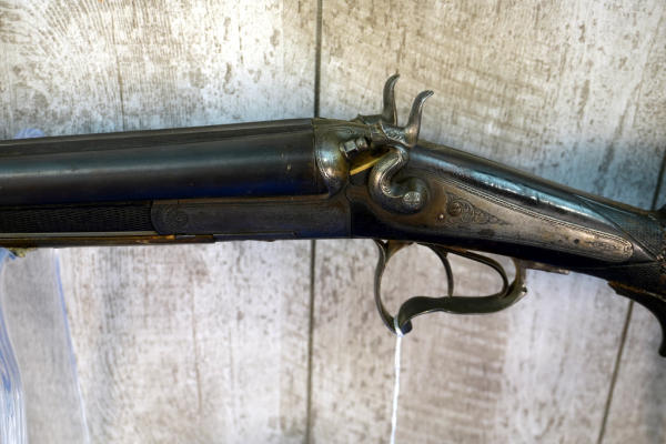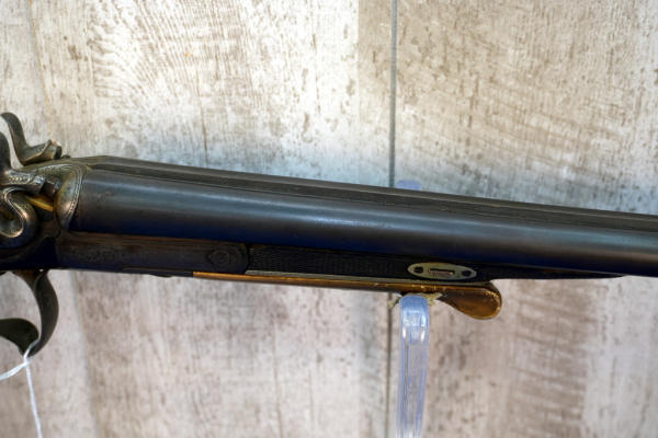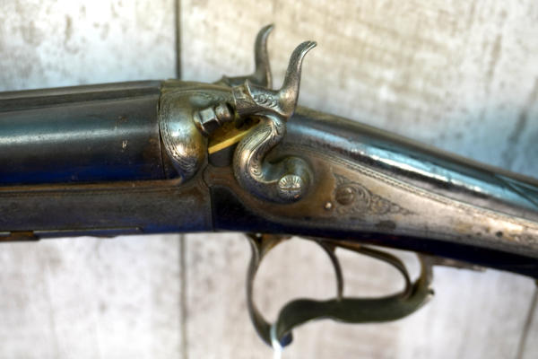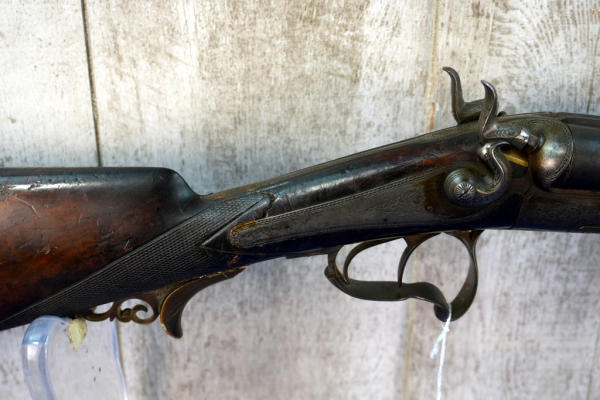 29" BBLs; there is not maker or model that I can find; has a release lever & finger grip made of what I believe is horn; finger grip has damage; stock is cracked and was glued; fancy engraving on the receiver panels; both are MC; the right hammer won't stay cocked, left one works; two triggers; plastic butt plate; more than likely a Belgium shotgun; this was a fancy gun back in it's day! No Transfer need due to age; SN#6849