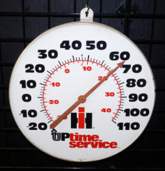 18" across, no glass cover lens, decent color, could use a cleaning, barn hanger