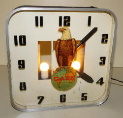 15"x15", nice working original, lights up and runs, some discoloration to the face, but good color and yellow printing on the face is good too; this is the original clock out of the Burke, SD dealership! No shipping, pickup only