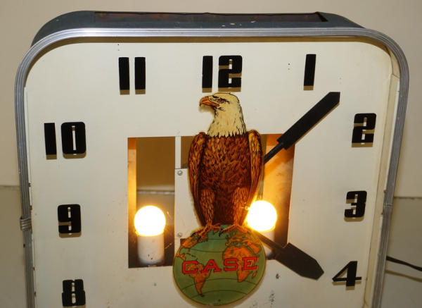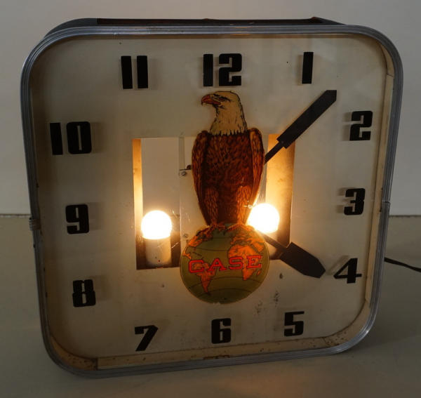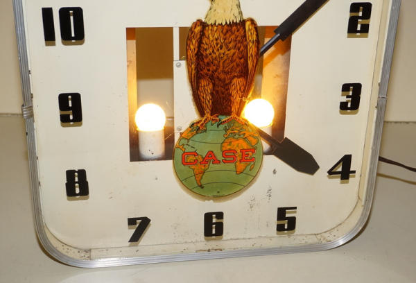 about 16"x15", lights up and runs, Old clock with an old decal on the face, I'm pretty sure it didn't come from case this way, but still has a great look to it