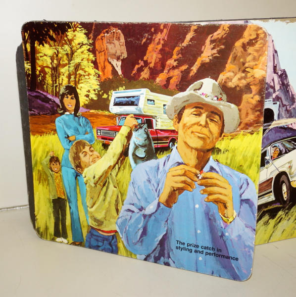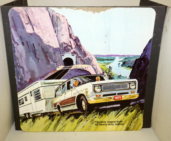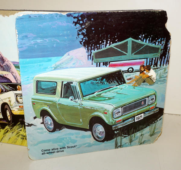 3 signs are each 15"x15", all attached to a black cardboard backing, this piece was used and has some damage to the Scout & Travelall signs, pickup one is good