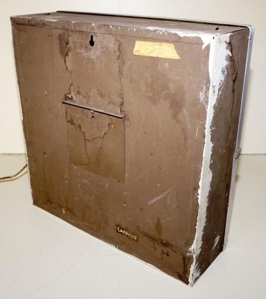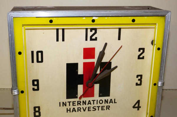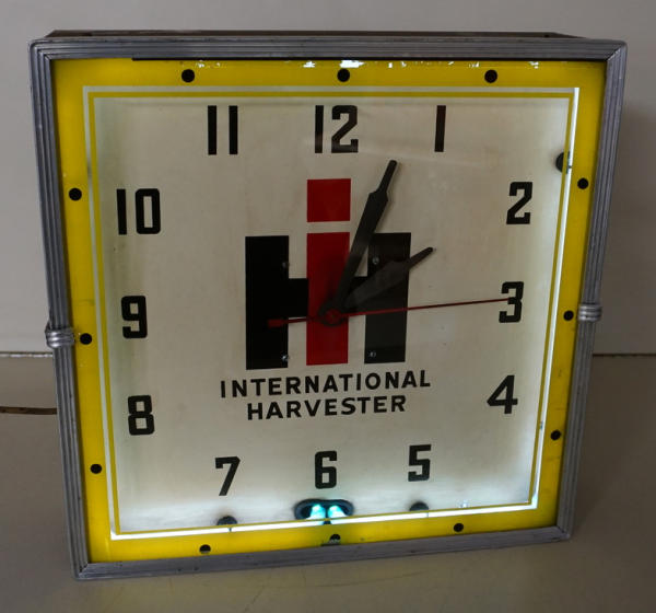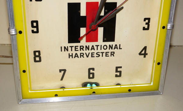 15"x15", nice working original, lights up and runs, some discoloration to the face, but good color and yellow printing on the face is good too; this is the original clock out of the Burke, SD dealership! No shipping, pickup only