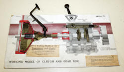 12"x6.5", heavy cardstock with tin lever and pedal, shows how the clutch & trans move, complete with some wear, comes in a nice showcase to display, unique piece