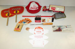 #313 - Box Lot of Older Coca-Cola Memorabilia--2 Hand Fans, Flyswatter, Felt kid's hat, Small Toy truck & more
