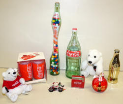 #317 - Box lot of Newer Coca-Cola Memorabilia--Glass Bottles, 4pc Glass set, & stuffed bears