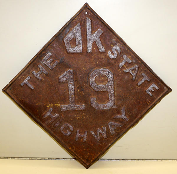 14"x14" square, no paint left, letters have been highlighted with chalk, torn by the "9", early sign