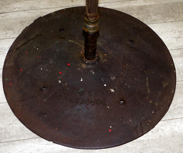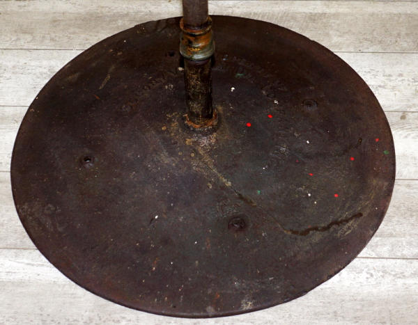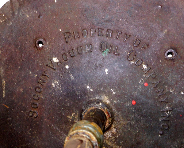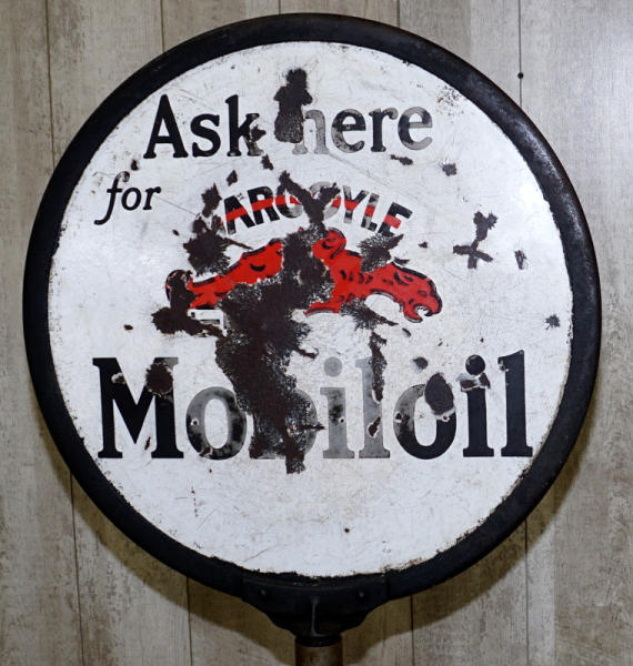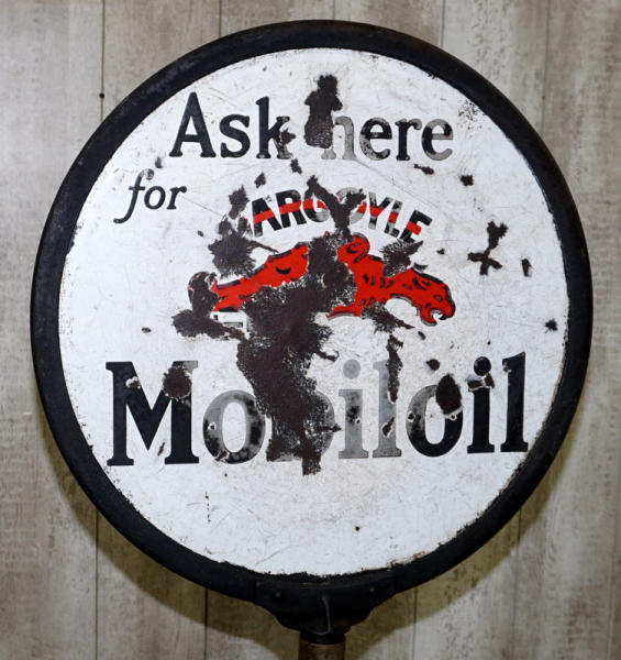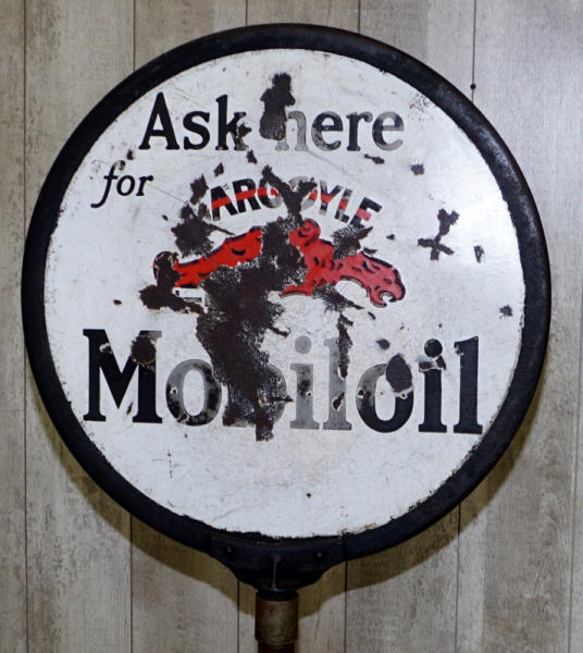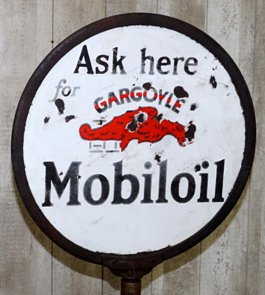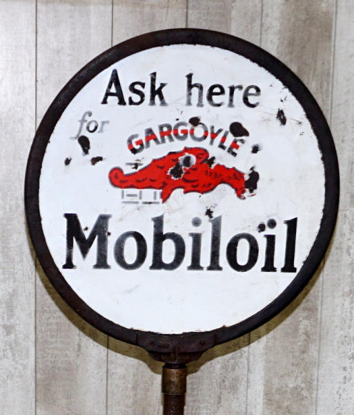 20" sign, both sides have numerous chips and wear, original large cast iron base marked "Socony Vacuum Oil Co.",; no shipping, pickup in Wakonda only