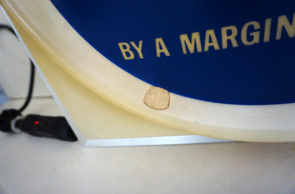 20"x20", plastic embossed face with aluminum can, new LED lights inside, has a crack on the left side and a nickel size hole in the bottom at about 7 o'clock, lights up bright, no shipping