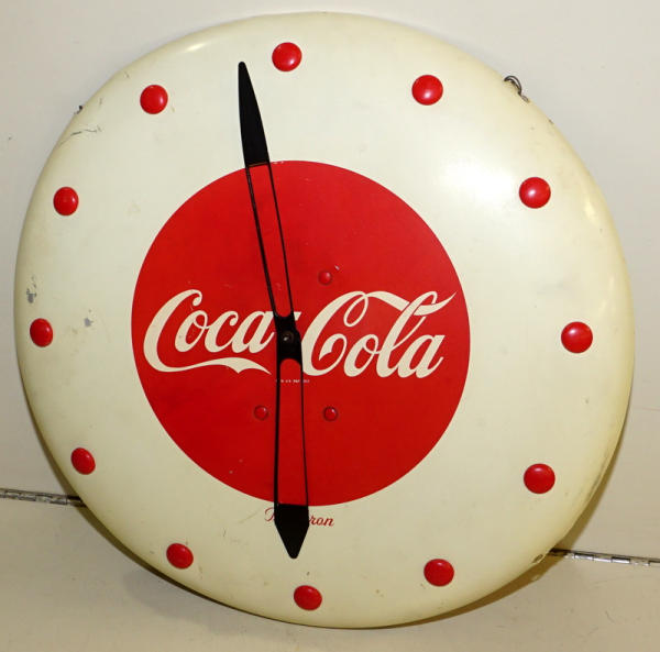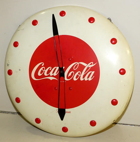 16" across, few small scuffs and scratches, believe it works, hard to find Coke clock