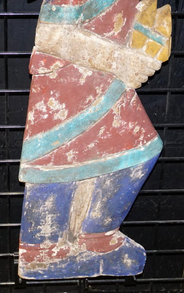 40" tall, lightweight hand carved wood, paint has heavy wear, I'm not sure on the age, I don't think it's 100-years old, but definitely has some age to it, neat piece