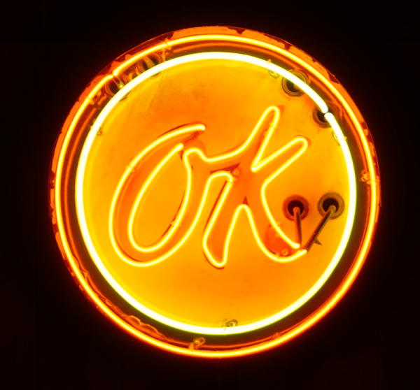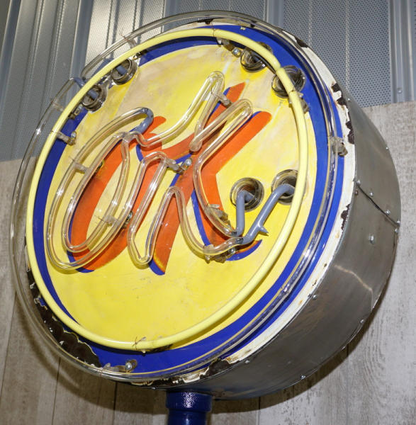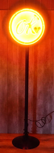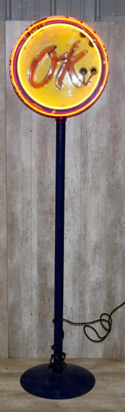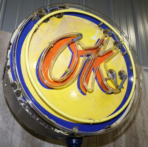 23" face, faded and has heavy chips around the edges, on a stand and is about 8' tall displayed; new neon with "OK" flashing on and off, displays great, bright neon, no shipping, pickup only