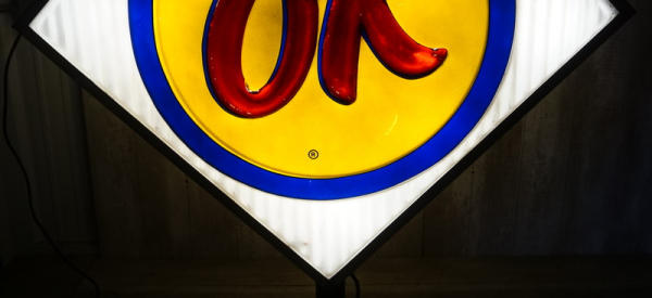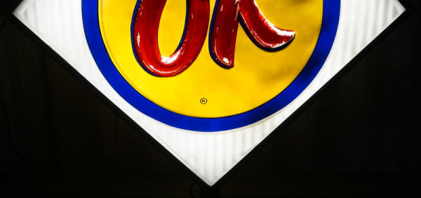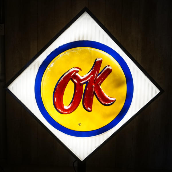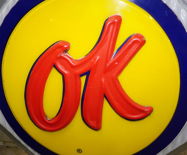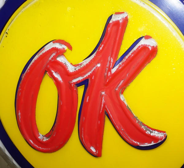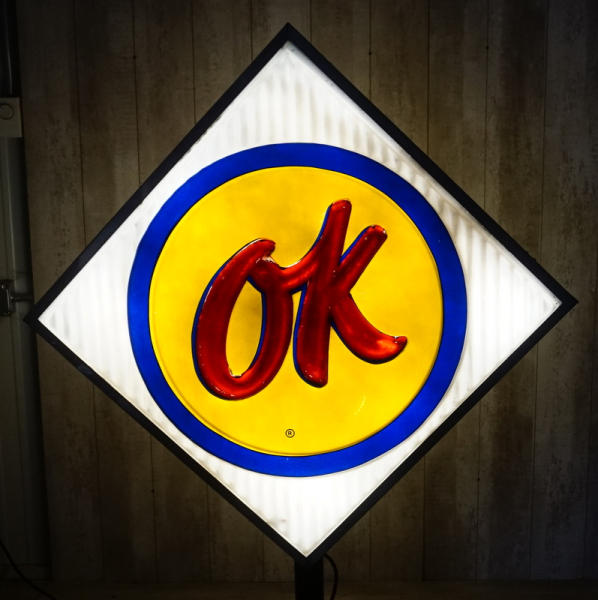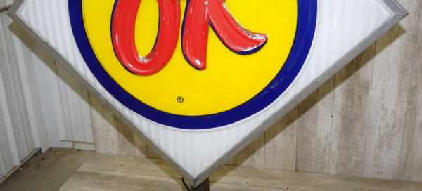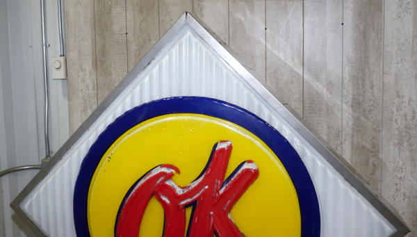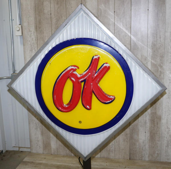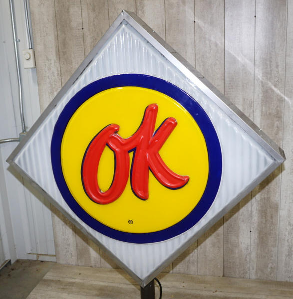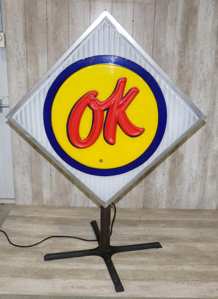 36"x36" square faces, both sides have good plastic, but the red "OK" has been repainted on one side and reverse side has quite abet of flaking, in the original stainless steel can, on a base to display; new LED lights inside, lights up and works good, no shipping, pickup only