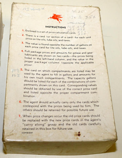 large set of cards, shows prices from 7c to 35c up to 1000-gallons; these were for the bulk-truck drivers to figure bills, box has some wear, but a unique set, cards inside are nice, cards are 8"x5"