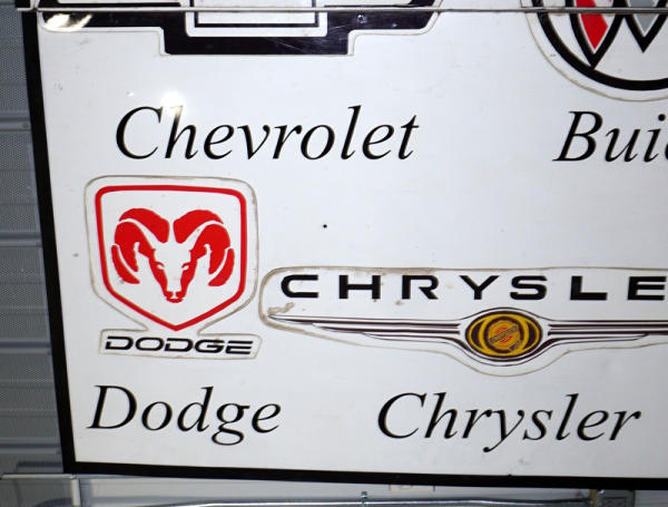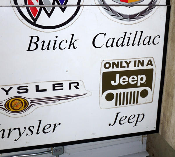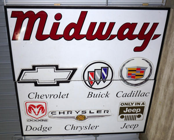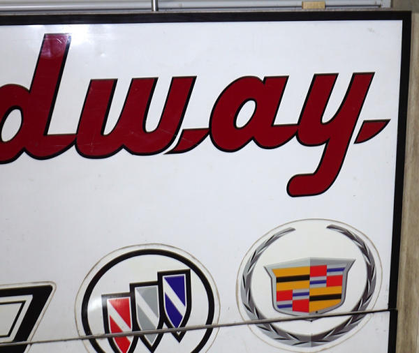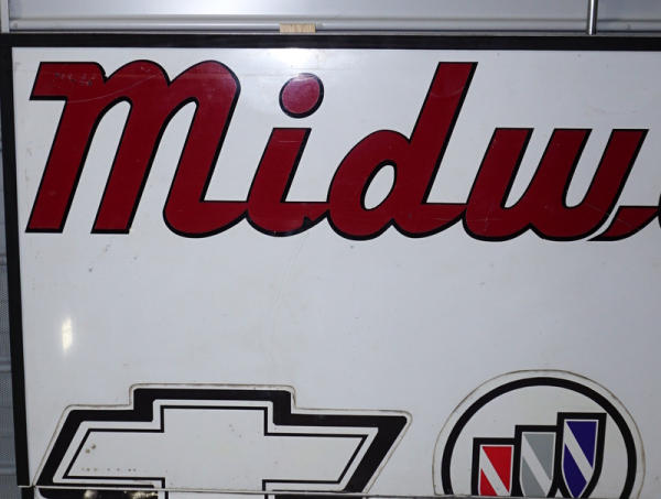 overall makes a 8'x8' sign, vinyl lettering overall metal with a wood frame, comes in two pieces, has some wear, but does come into two pieces; no shipping, pickup only, great for what ever brand you prefer!