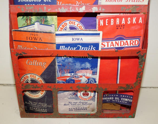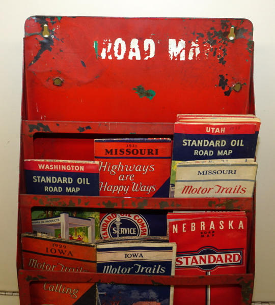 Cities Service Rack that was overpainted to Red, heavy wear, includes a selection of maps, most with heavy wear too