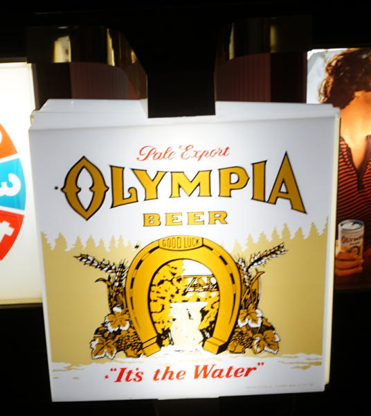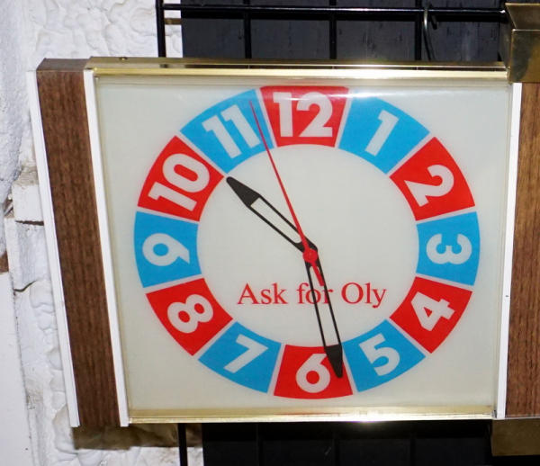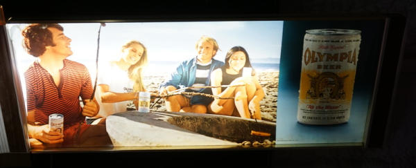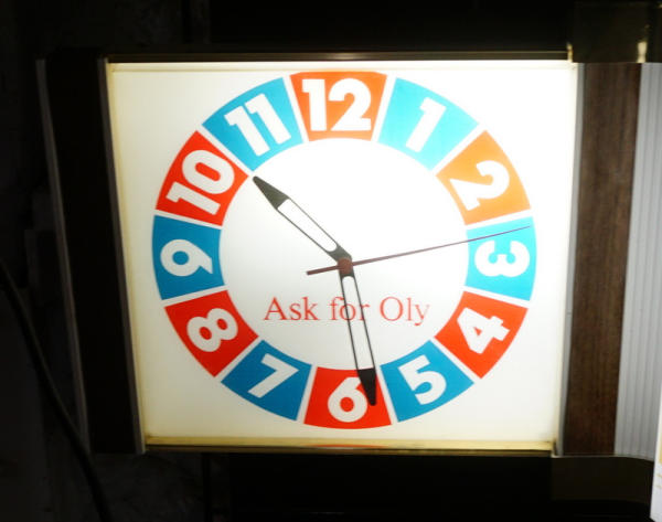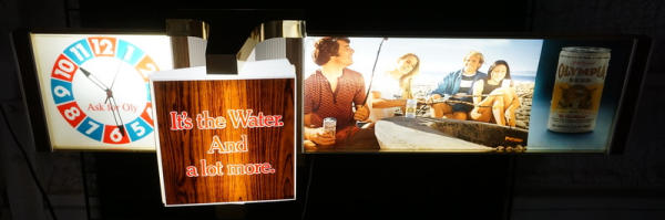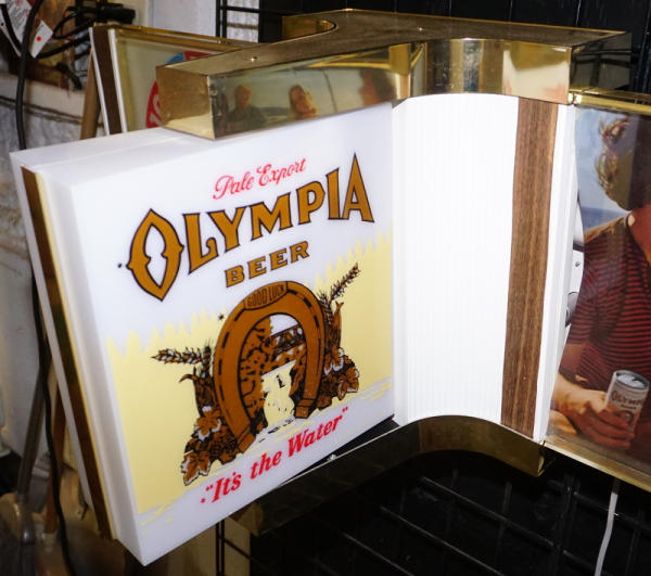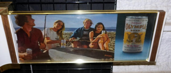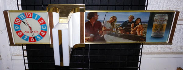 5' long, 16" tall, great color and condition, few minor scratches in the face, but I believe this was an NOS sign when it was found and never hung in a bar, only in a collection; clock works, motion works, large & impressive OLY sign! No shipping, pickup only