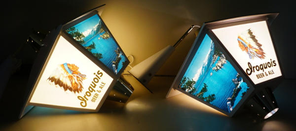 shades are 11"x11", about 12" tall, both really clean with the hanging brackets too, great looking graphics signs, sells 2x the money