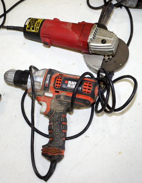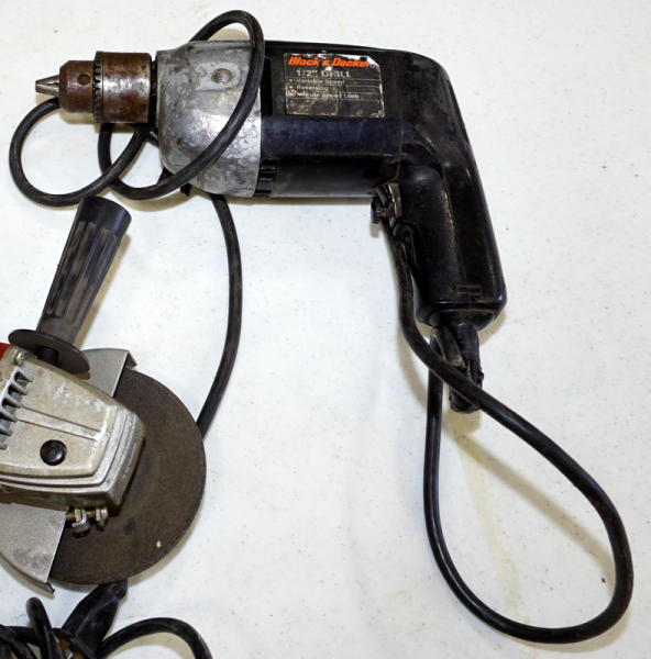 2 Corded Drills, 1 18V Drill w/ Battery NO CHARGER, 1 corded angle Grinder, all to go