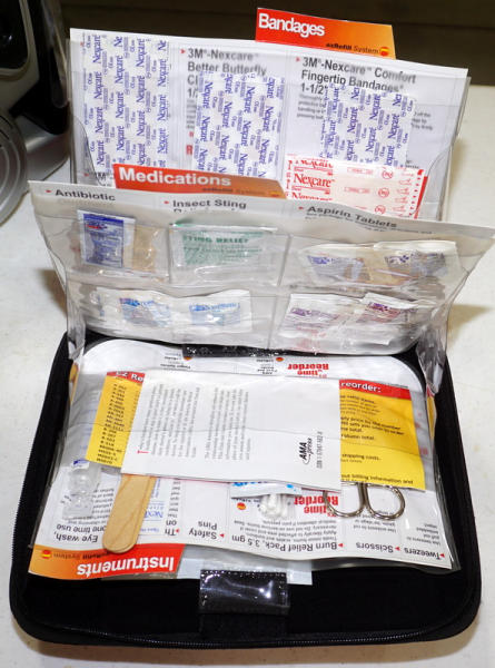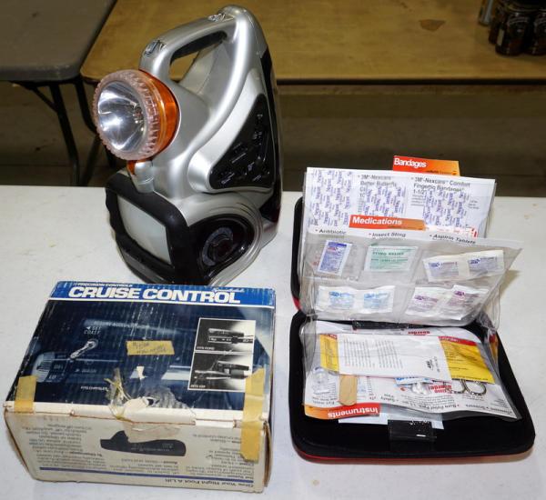 First aid kit looks to be complete, Cruise Control looks to be never installed, Light might work do not have cord for it, all to go