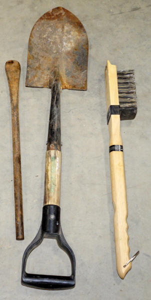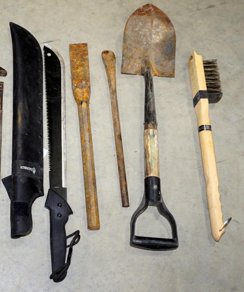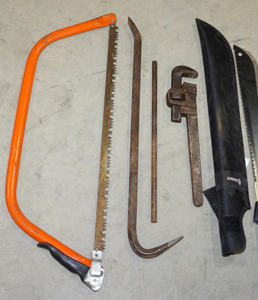 Hand Saw, Crow bar, Tire irons, Pipe wrench, Shovel, Grill brush, Machete, all to go