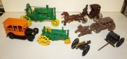 #971 - Box Lot of Reproduction Cast Iron Toys--Tractor, Horse Drawn & other misc.