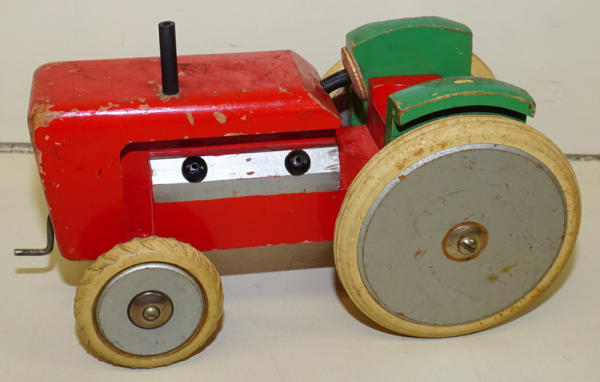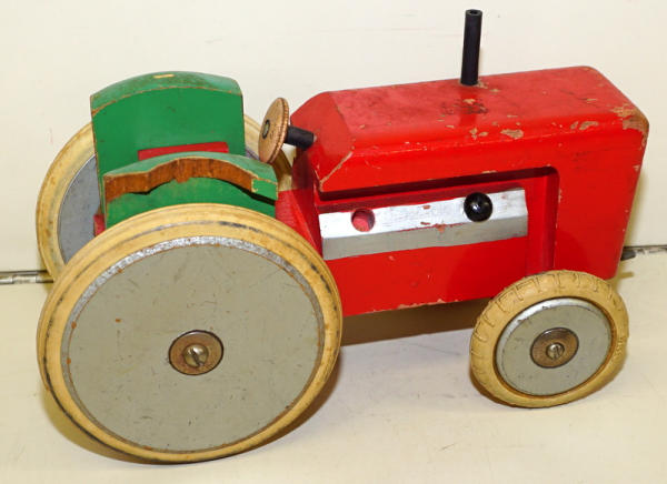 10.5" long, has a piece broken off the fender and general play wear, missing a driver or seat and maybe some other parts, not sure on the maker