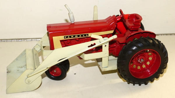 Tractor has metal rears and clam fenders, older, but nice restoration; Loader is an average repaint and has some rust & pitting in the bucket