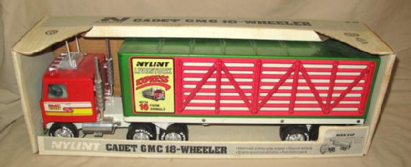 NIB, very unusual color for the trailer, toys are near mint, box has some light wear and staining, could use cleaning