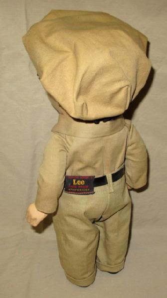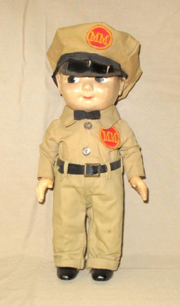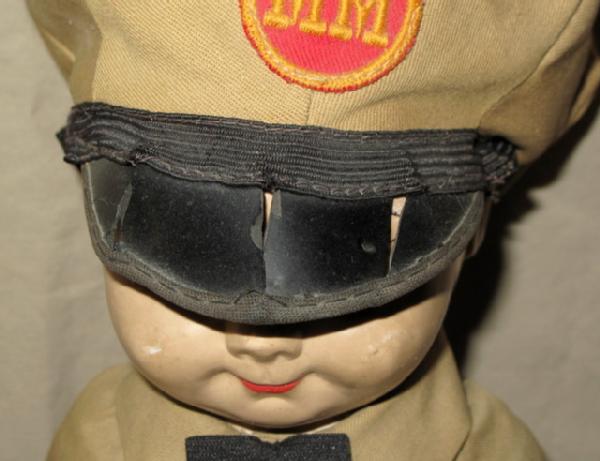 Super rare! Great, all original uniform. Shows some age with some cracks to the brim of the hat. Doll has some soiling on the face that will clean up, about as rare of Moline toy as you can get!