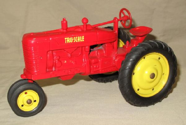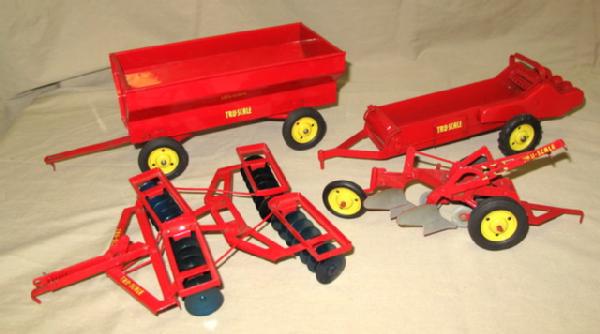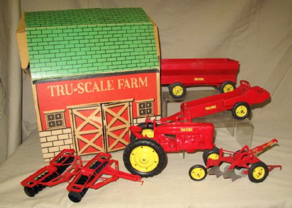 Toys are all in near mint condition! Includes M, Spreader, 2b Plow Wagon, and Drag Disc. Box is nice, has been folded into the barn and has some general wear, but overall is complete and good shape. Another Super Rare Tru-Scale Toy!