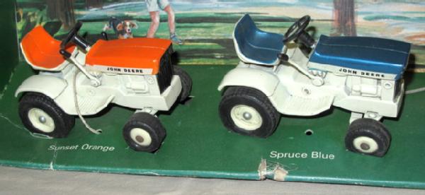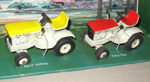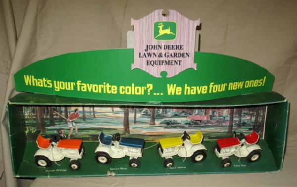 Toys are all great, near mint originals. Main part of the box is original and good condition, small puncture by the blue tractor. Top marquee and sign are reproductions of the original, but look good on the piece. Hard to find set, each dealer could buy one to use as a display to sell the real and individual toy tractors.