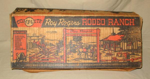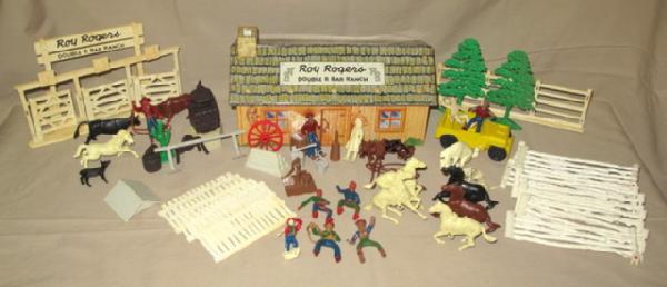 includes the tin building, 10 Figures, 10pcs of fence, 7 horses, jeep, rodeo chute,, gate & accessories. All has normal wear, box has a torn edge and general wear