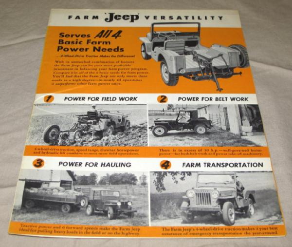 unfolds into a poster, shows the Jeep doing anything a tractor can do on the farm with a PTO, some wear