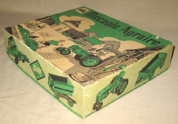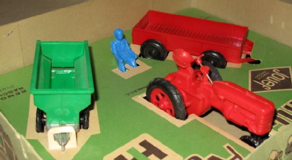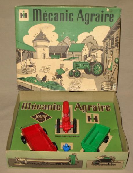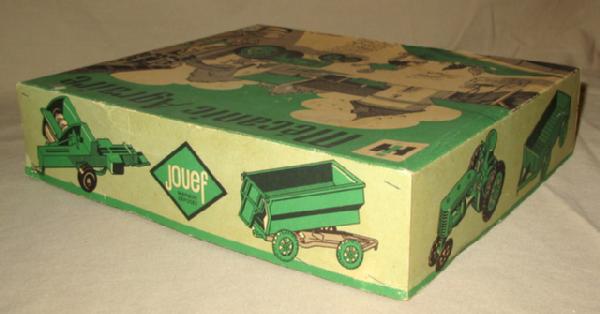 Very scarce. Includes a Farmall C, 4-wheel trailer, driver, and Flarebox wagon. Toys are all near mint except steering wheel is broken. Tractor is 4" long. Box is very nice and has great graphics. Overall box rates 8.75 condition. Awesome