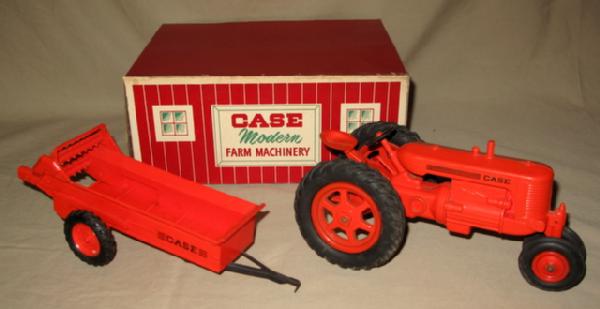 good top bar on spreader, tractor has no fenders, toys are nice and box is also nice with just some light wear from age, neat set