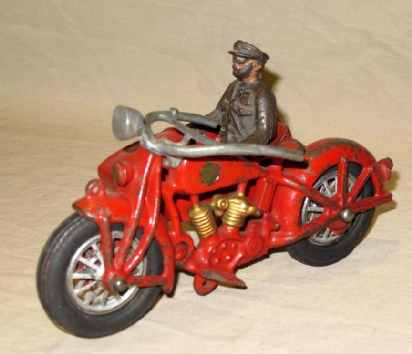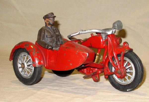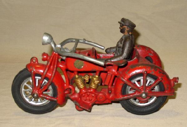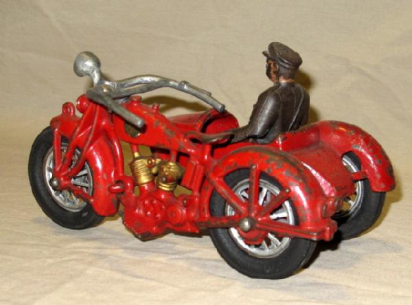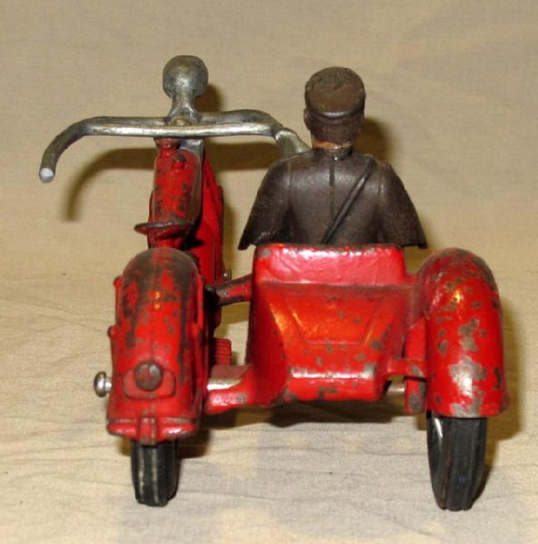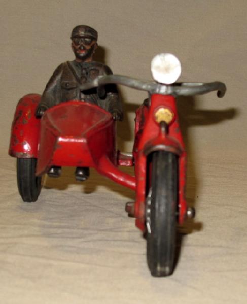 different style tank with a "Hubley" decal on the tank, also has the loop on the front fender for the pull string. Paint is about 70%. Does have a chip on the left foot rest and no driver, just the passenger, 9" long