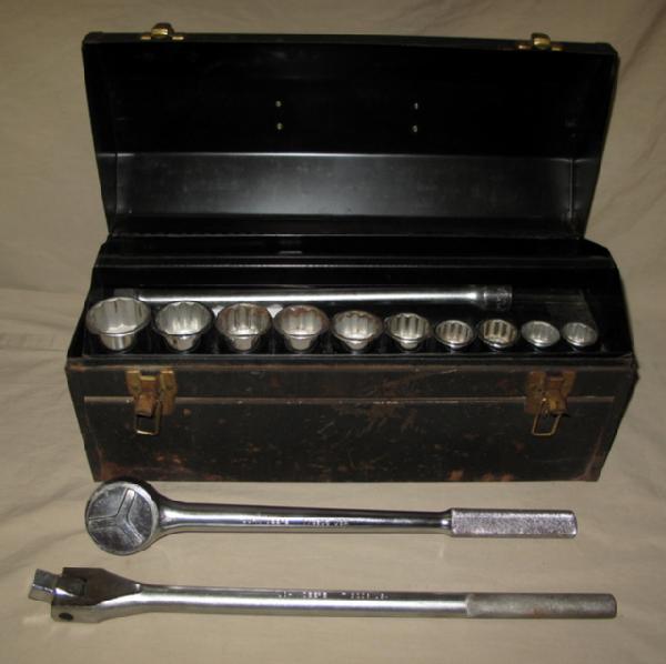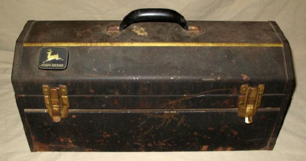 all John Deere Pieces, no deer logo, just reads "JOHN DEERE" on the tools, most are near mint, some sockets show some wear, toolbox rates 7 condition, sells as a set for one money