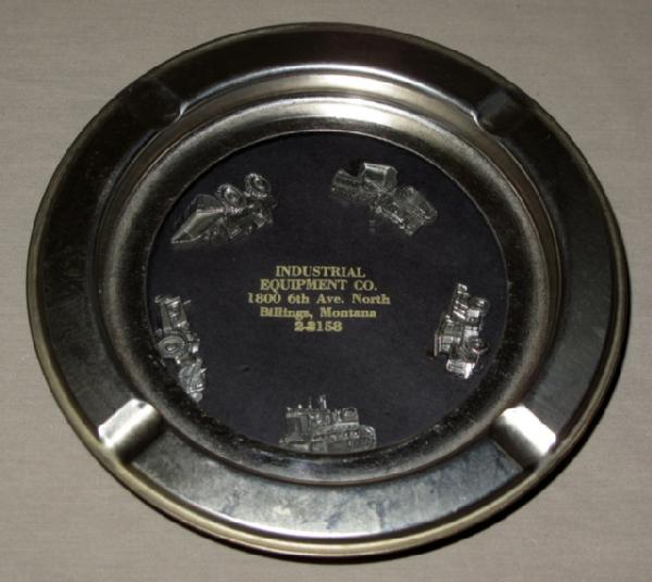 nice piece with metal figural pieces of construction equipment mounted under a glass base, 6.5" across, near mint