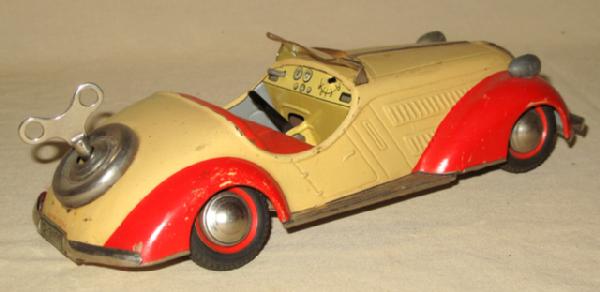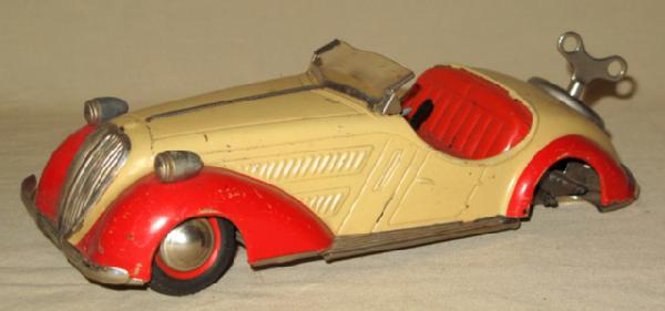 9.5" long, missing one wheel, key wind works, has some scuffs and scratches, rates 85% paint overall