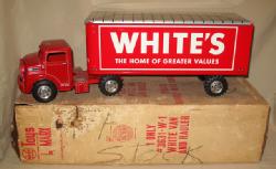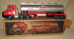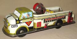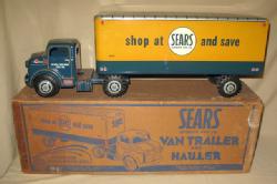 Another near mint truck! Has some light box scuffs on top of the trailer, otherwise unplayed with and next to mint. Box again has a lot of insect damage and dry rot, rates a 6 overall, one outside flap is torn off. Beautiful colors, 25" long, has the box liner