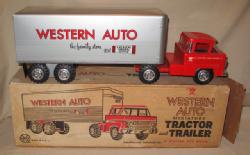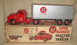 Plastic Cab w/ metal trailer, Mint Toy, box is dry rotted and has general wear