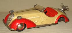 9.5" long, missing one wheel, key wind works, has some scuffs and scratches, rates 85% paint overall