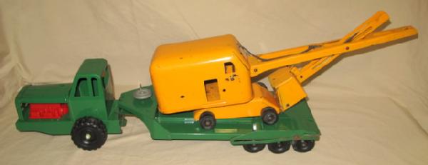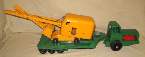 Truck is 24" long, rates about 90% paint, excavator is about 85% paint and decals are worn, sells for one money for the set