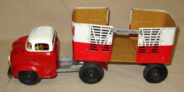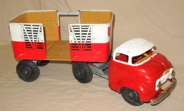 about 18" long, unusual large size for a Jap Tin Toy, missing a brace for the right side of the trailer, has some scratches & scuffs, friction works